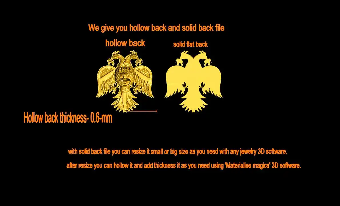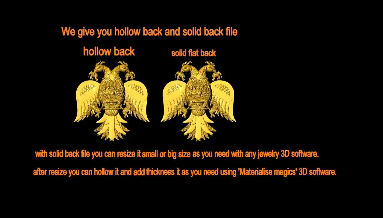This is a jewelry CAM file, CAD file, stl file, 3D-printing file. For jewelry CAD, CAM and metal casting purpose. Model name is :- ” Gandaberunda stl file “. This file is for jewelry manufacturing company or other 3D printing ornaments manufacturing company. We can use this Gandaberunda stl file as a Jewelry Pendant, Earrings, Nacklace center piece or other purpose. You can find all details of the product in product image. We give you (normal stl, magics fix stl, 3dmstl and obj) file format in zip file.