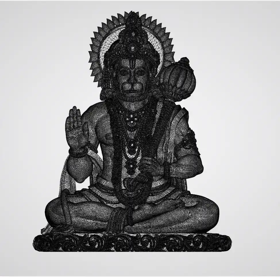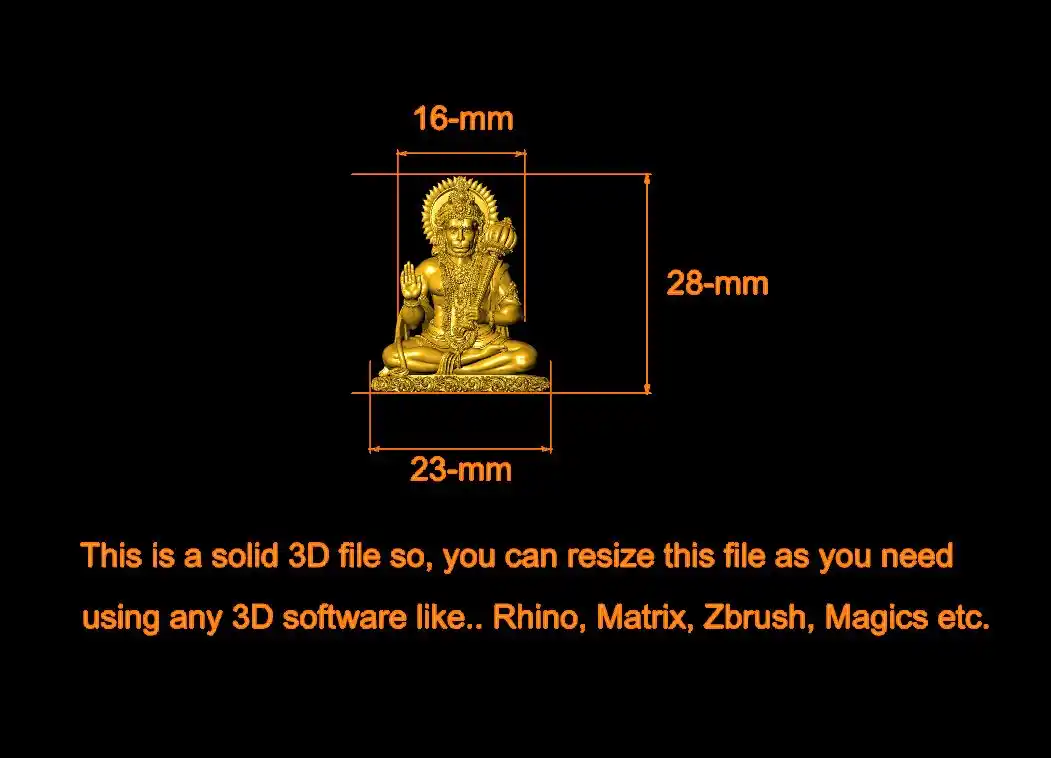 We give you this 'Hanumanji cad file ' a solid 3D back file so, With a solid 3D back file you can resize according to your requirement, by using any 3D software, like.. (Rhino, Matrix, Magics, Zbrush etc.)