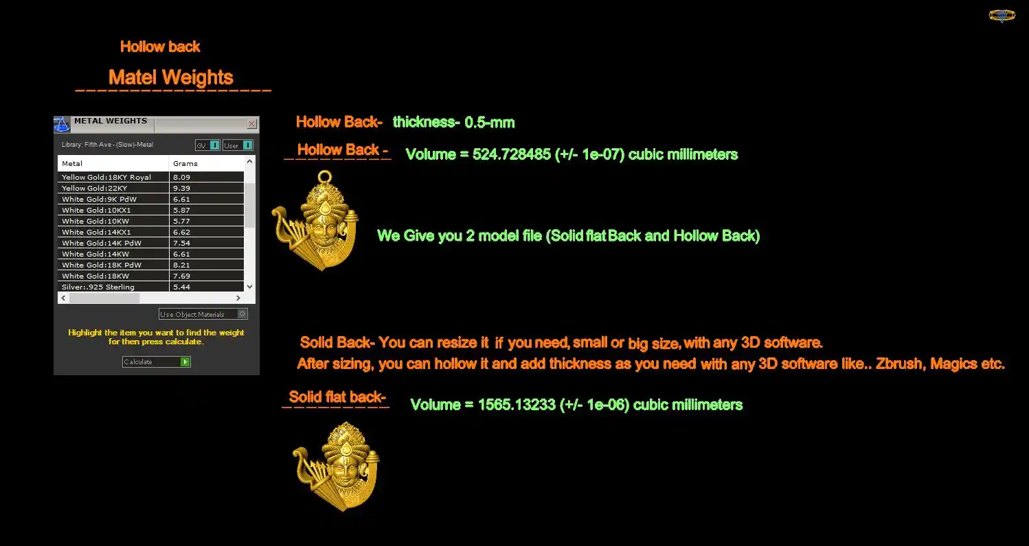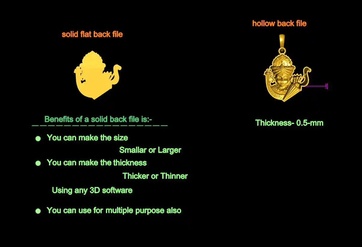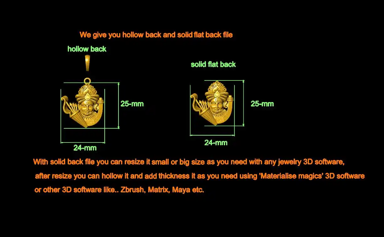 We give you this ' Khatu Shyam Pendant File-3 ' with a hollow back and solid flat back file also, with solid back file you can resize it and hollow it and add thickness according to your requirement, by using any jewelry 3D software, like.. (Rhino, Matrix, Magics, Zbrush etc.)