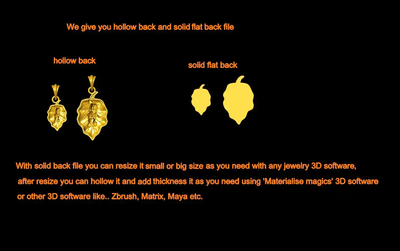 I give you this ' Little Krishna Pendant File-4 ' file with a hollow back and solid flat back also, with solid back file you can resize it and hollow it and add thickness according to your requirement, by using any jewelry 3D software, like.. (Rhino, Matrix, Magics, Zbrush etc.)