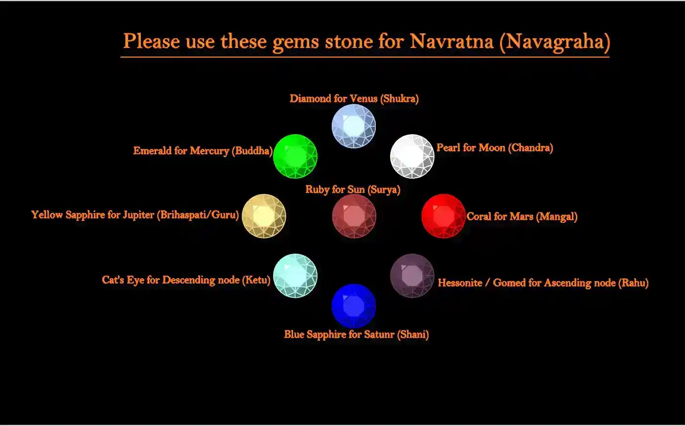1- Ruby for Sun (Surya)2- Pearl for Moon (Chandra)3- Coral for Mars (Mangal)4- Hessonite for Ascending node (Rahu)5- Blue Sapphire for Saturn (Shani)6- Cat's eye for Descending node (Ketu)7- Yellow Sapphire for Jupiter (Brihaspati / Guru)8- Emerald for Mercury (Buddha)9- Diamond for Venus (Shukra).
