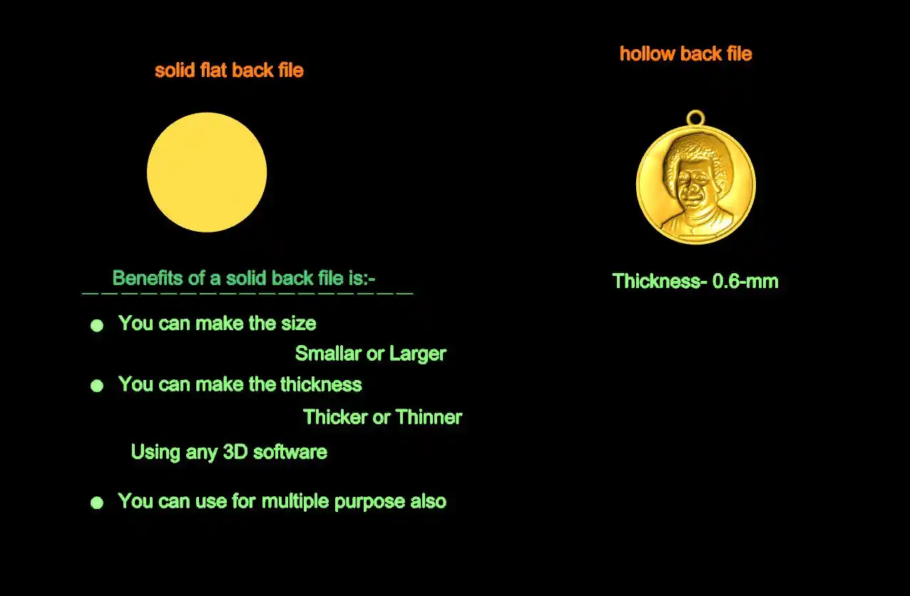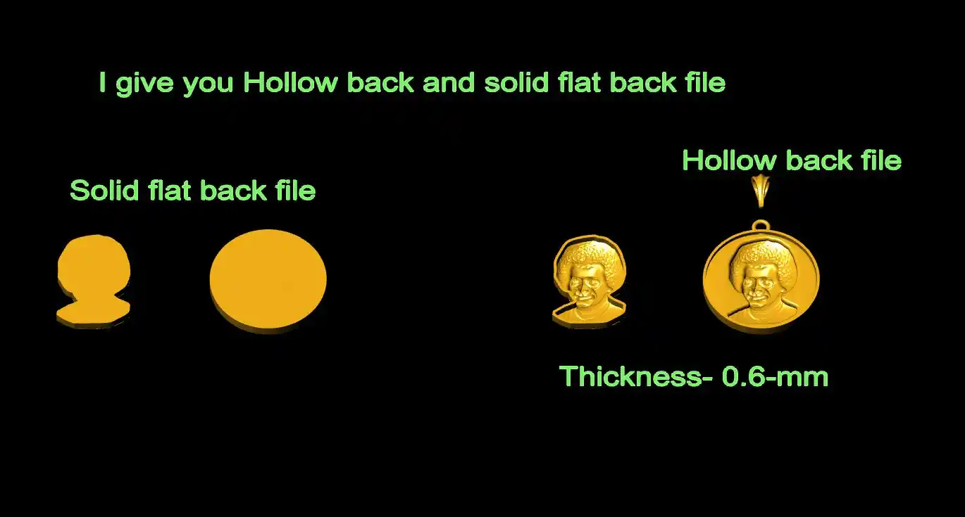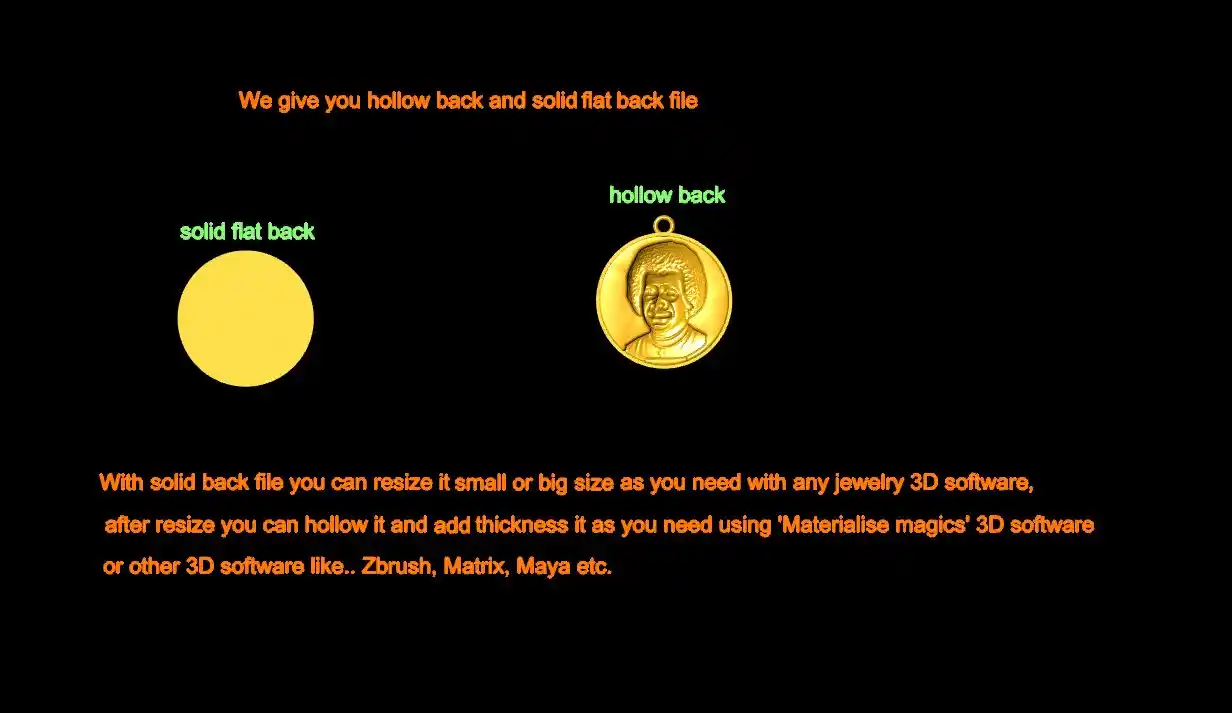 We give you this ' Sathya Saibaba pendant file ' with a hollow back and solid flat back file also, with solid back file you can resize it and hollow it and add thickness according to your requirement, by using any jewelry 3D software, like.. (Rhino, Matrix, Magics, Zbrush etc.)
