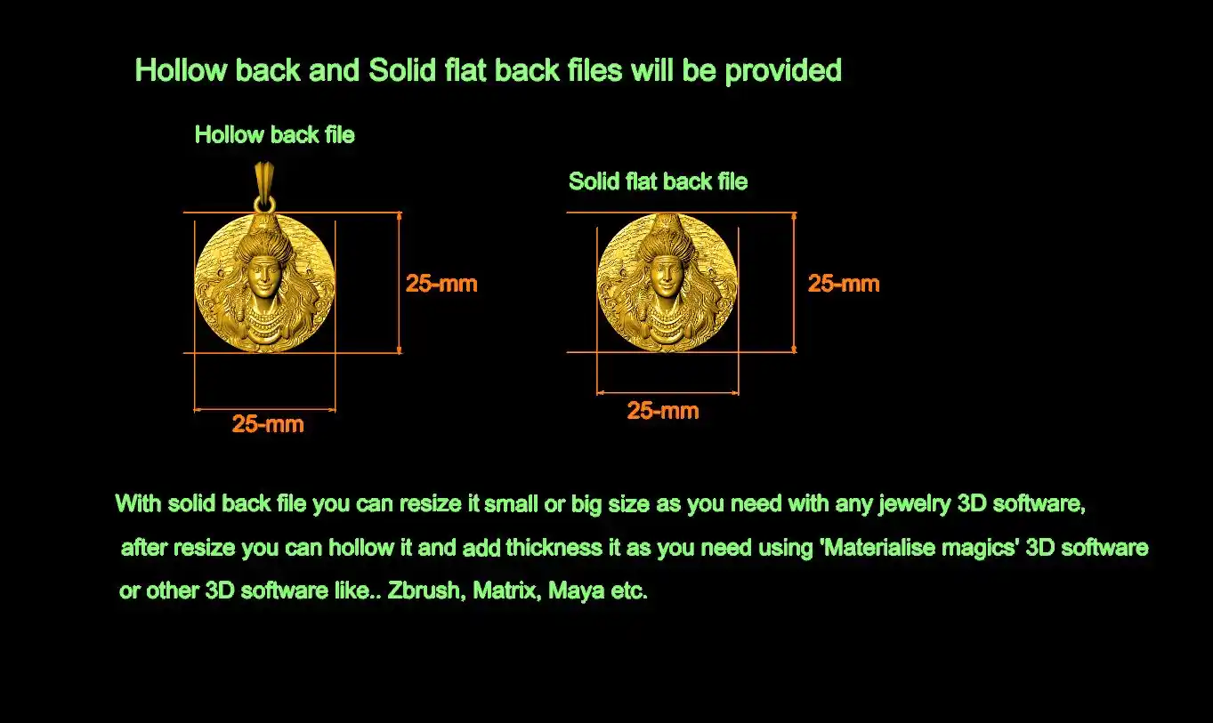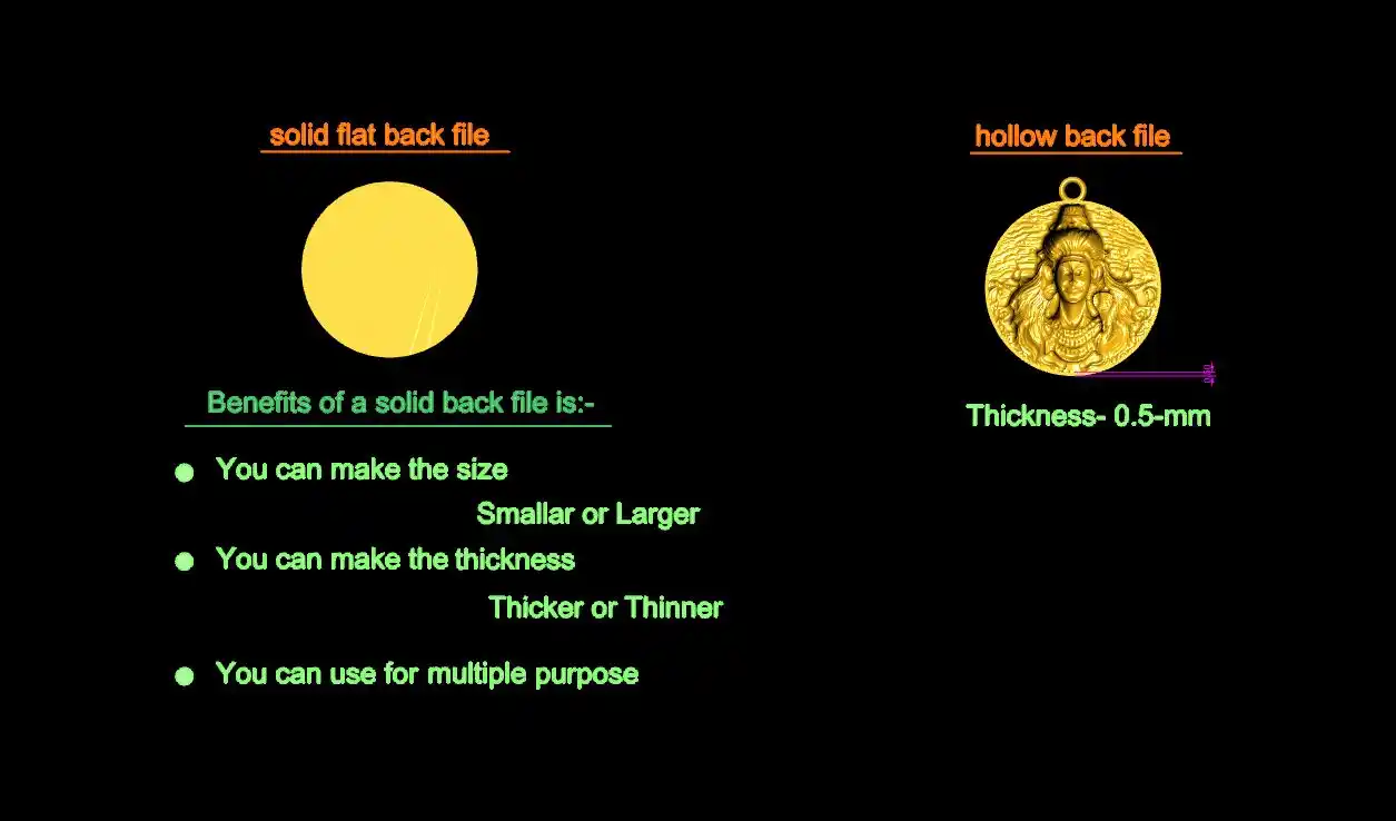 Solid flat back file benefits: You can use this for multiple purpose and you can resize it small or big and hollow it and add thickness according to your requirement, using any jewelry 3D software, like.. Rhino, Matrix, Magics, Zbrush etc.