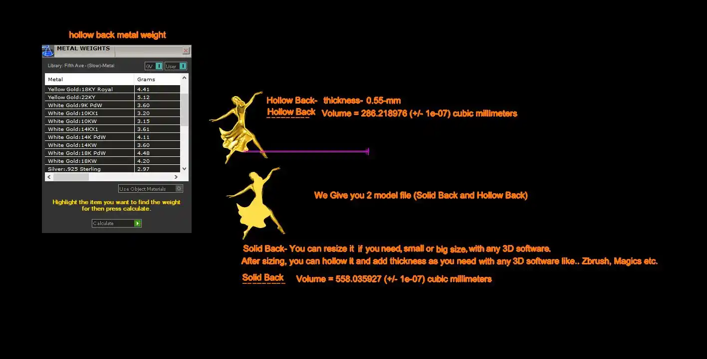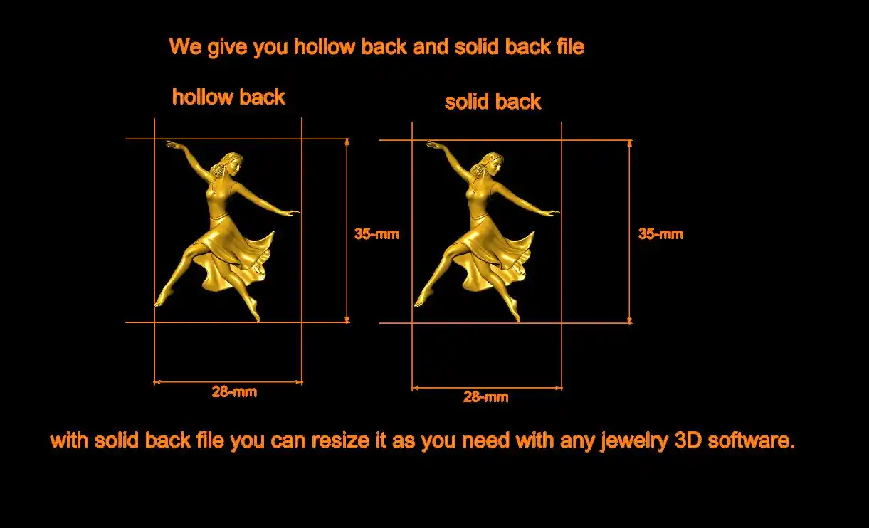We give you this '3D Lady CAD file' file with a hollow back and solid back also so, With solid back you can resize, hollow, and add thickness according to your requirement, by using any jewelry 3D software, like.. (Rhino, Matrix, Magics, Zbrush etc.)