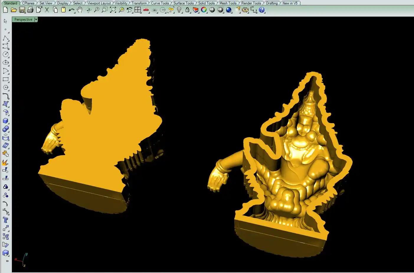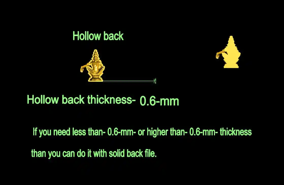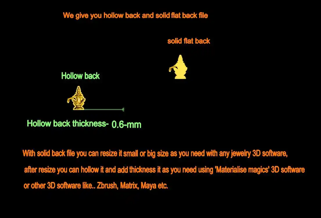 We give you this 'Ayyappa murti 3d file' file with a hollow back and solid flat back. With solid back file you can resize it small or big and hollow it and add thickness according to your requirement, by using any jewelry 3D software, like.. (Rhino, Matrix, Magics, Zbrush etc.)