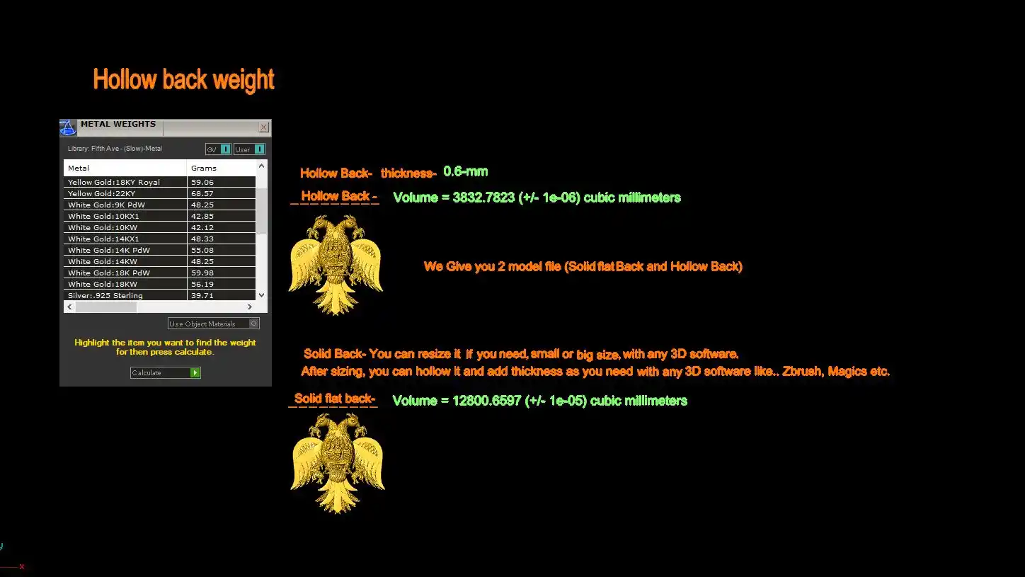 This is a jewelry CAM file, CAD file, stl file, 3D-printing file. For jewelry CAD, CAM and metal casting purpose. Model name is :- ” Gandaberunda stl file “. This file is for jewelry manufacturing company or other 3D printing ornaments manufacturing company. We can use this Gandaberunda stl file as a Jewelry Pendant, Earrings, Nacklace center piece or other purpose. You can find all details of the product in product image. We give you (normal stl, magics fix stl, 3dmstl and obj) file format in zip file.