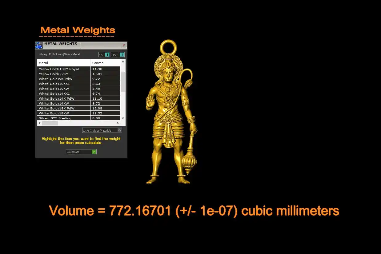 This is a jewelry CAD file, CAM file, 3Dprint file, STL file. For jewelry CAD, CAM, 3Dprint and metal casting purpose. You can also use this 3D file for other 3Dprinting purpose. Model name is :- " Hanumanji Pendant 3Dprint file-7 "